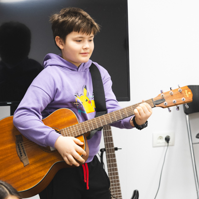 Unul dintre spațiile preferate de elevii noștri, care le oferă oportunitatea de a încerca diverse instrumente, fiind dotat cu pian, chitară, tobe, cajon, mandolină, tamburină, fluier etc. Copiii au ocazia să repete la instrumentul preferat, chiar și în pauze.
